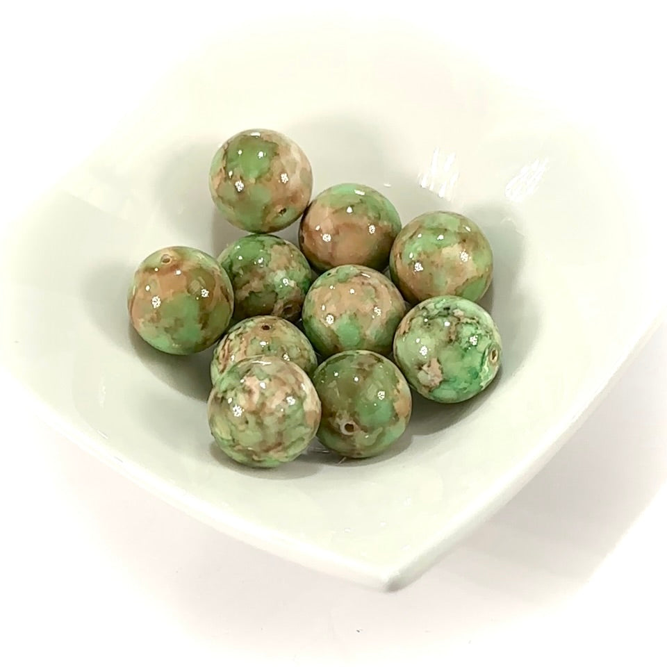 Czech Pressed Druk Round Smooth Glass Beads 14mm Green Brown Marble Pearlized 10 pieces CL1140